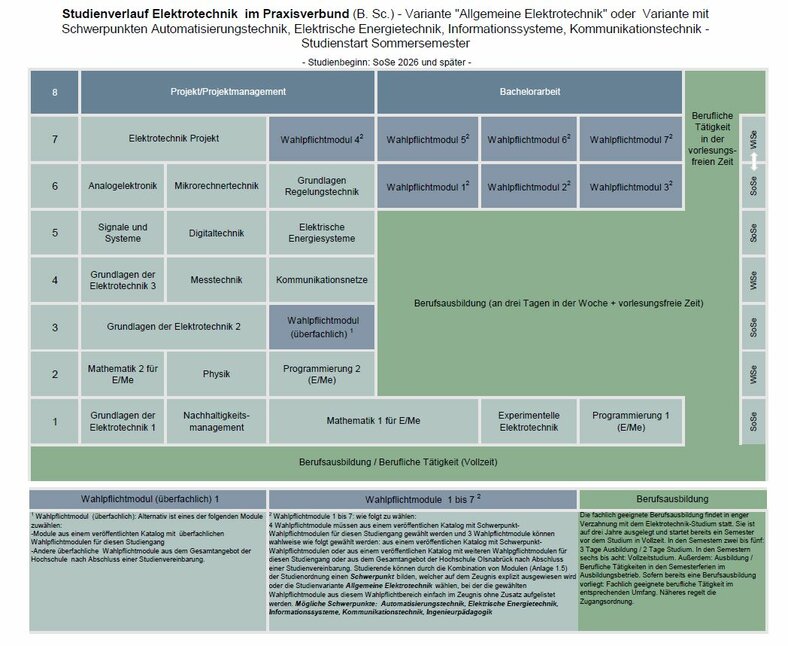 Die Regelstudienzeit des dual und modular aufgebauten Bachelorstudiengangs Elektrotechnik im Praxisverbund (EPV) beträgt acht Semester. Die Gesamtdauer des Ausbildungsganges beträgt - mit einer integrierten 3-jährigen Berufsausbildung - in der Regel 4,5 Jahre.